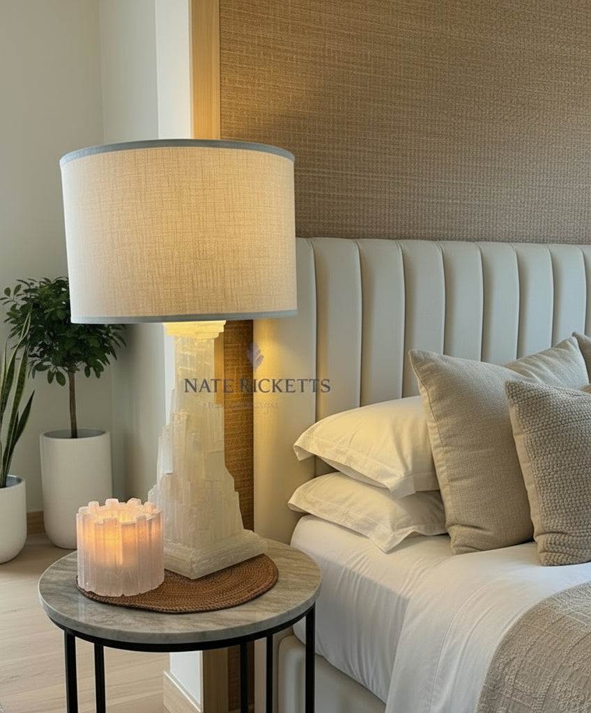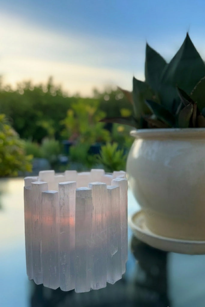 Set an enchanting mood by lighting a candle inside this selenite crystal votive candle holder, which, when backlit, creates a beautiful, pleasant ambiance.