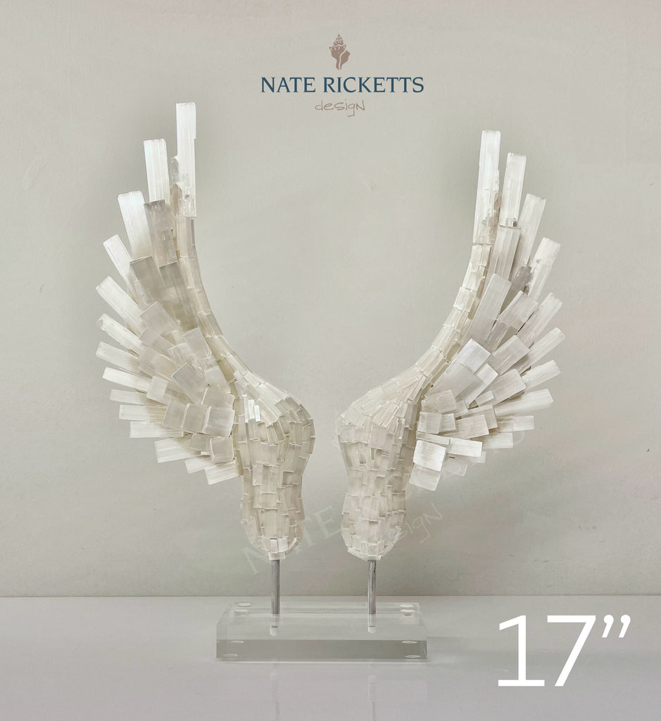 24" tall Selenite Crystal Angel Wings Sculpture mounted in 18"x4" acrylic base, or 17" tall sculpture in 3"x6" base.